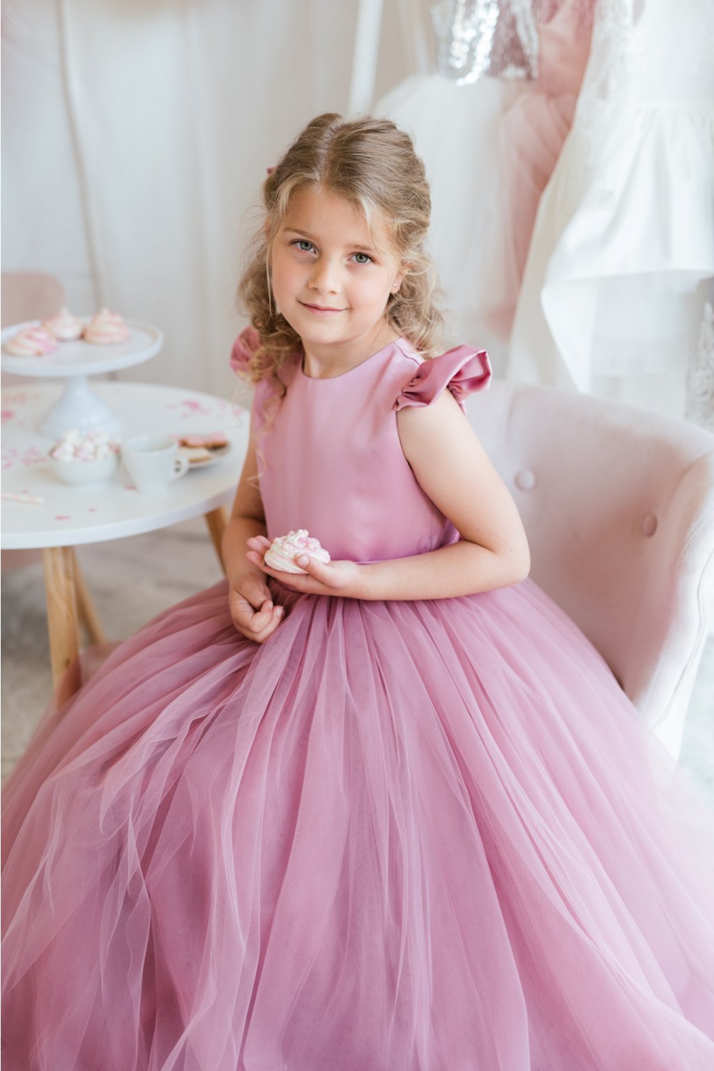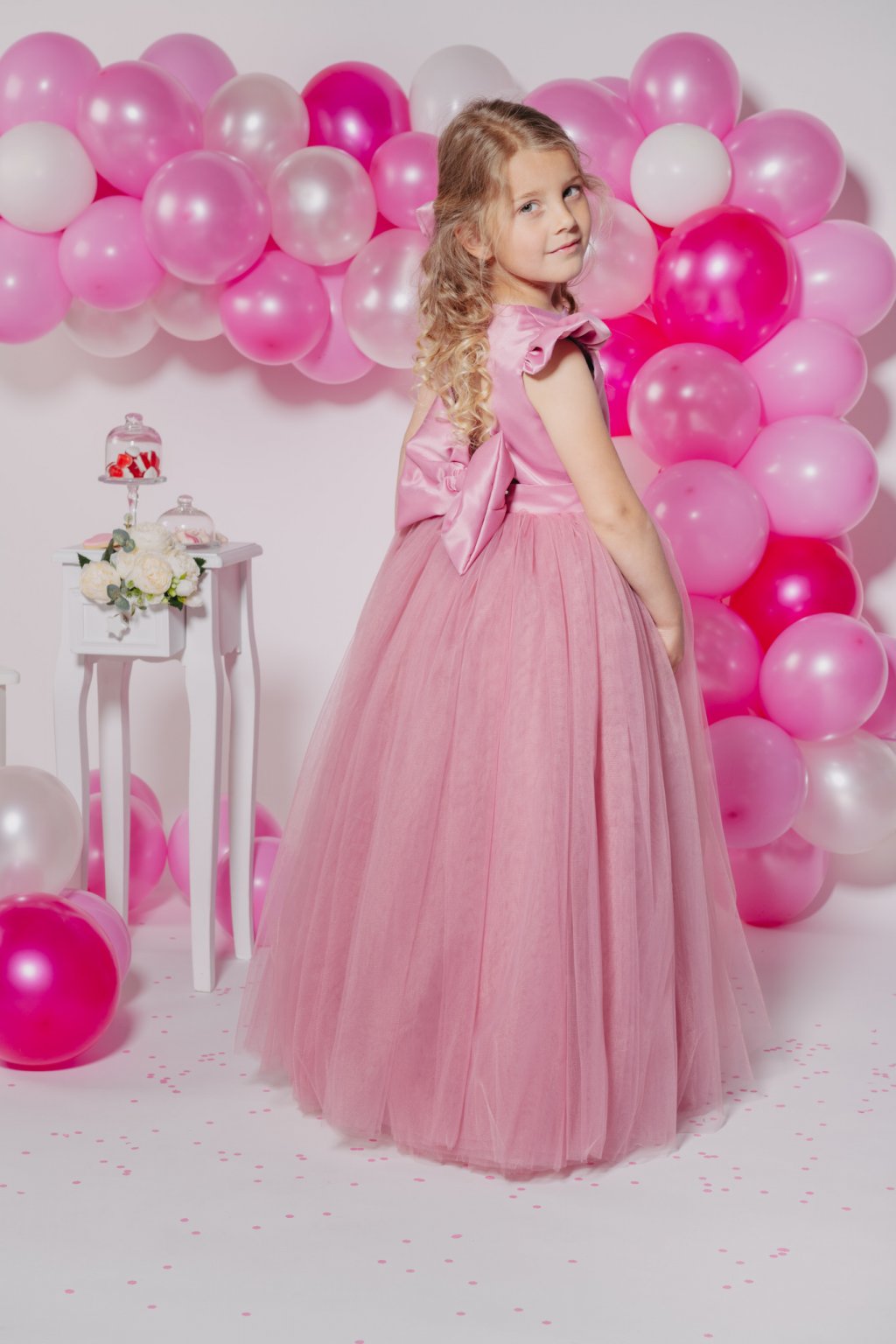 Princeznovské dlouhé šaty v růžovém tónu s mašlí na zádech a roztomilou mašličkou na zapínání.