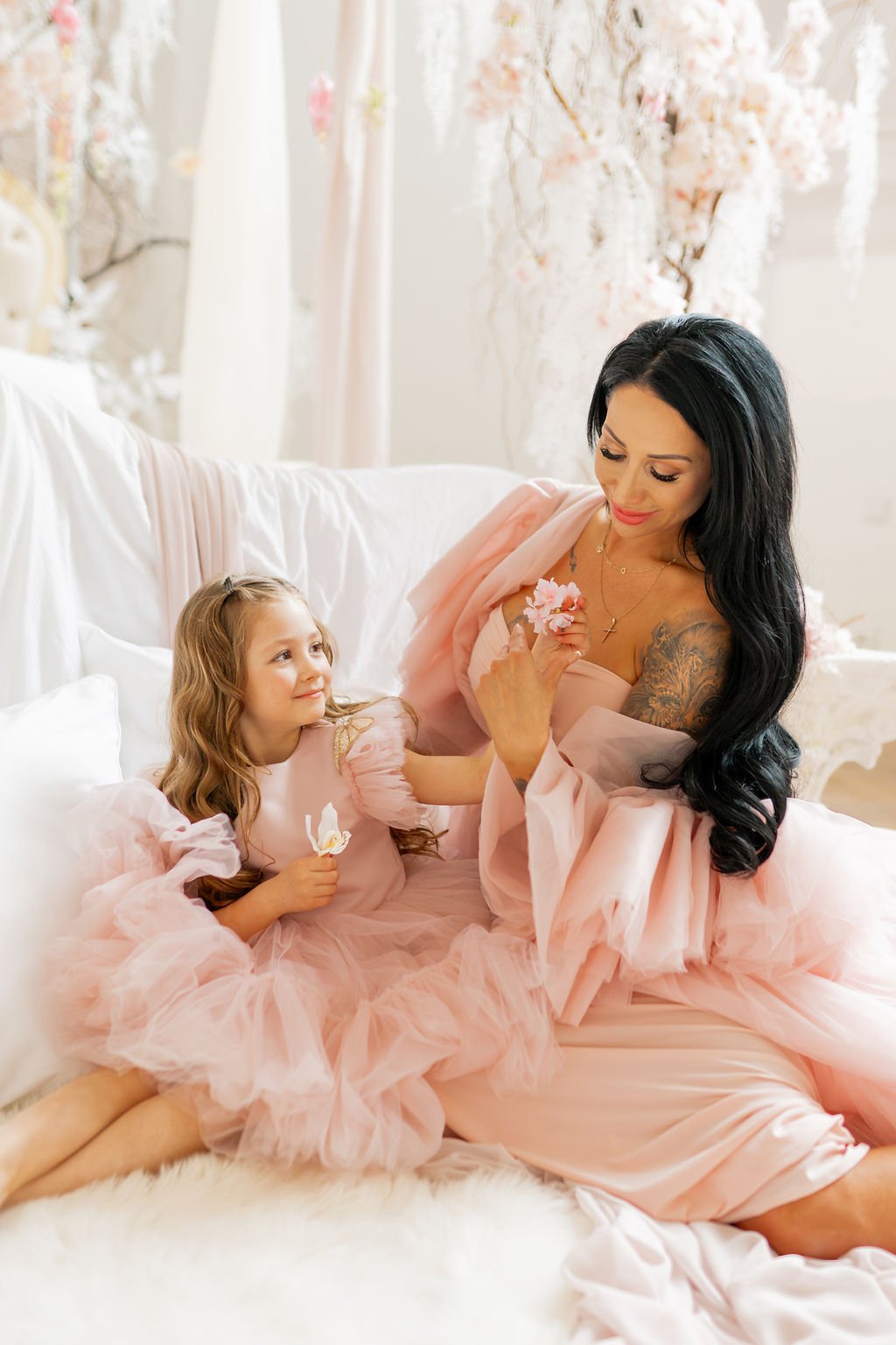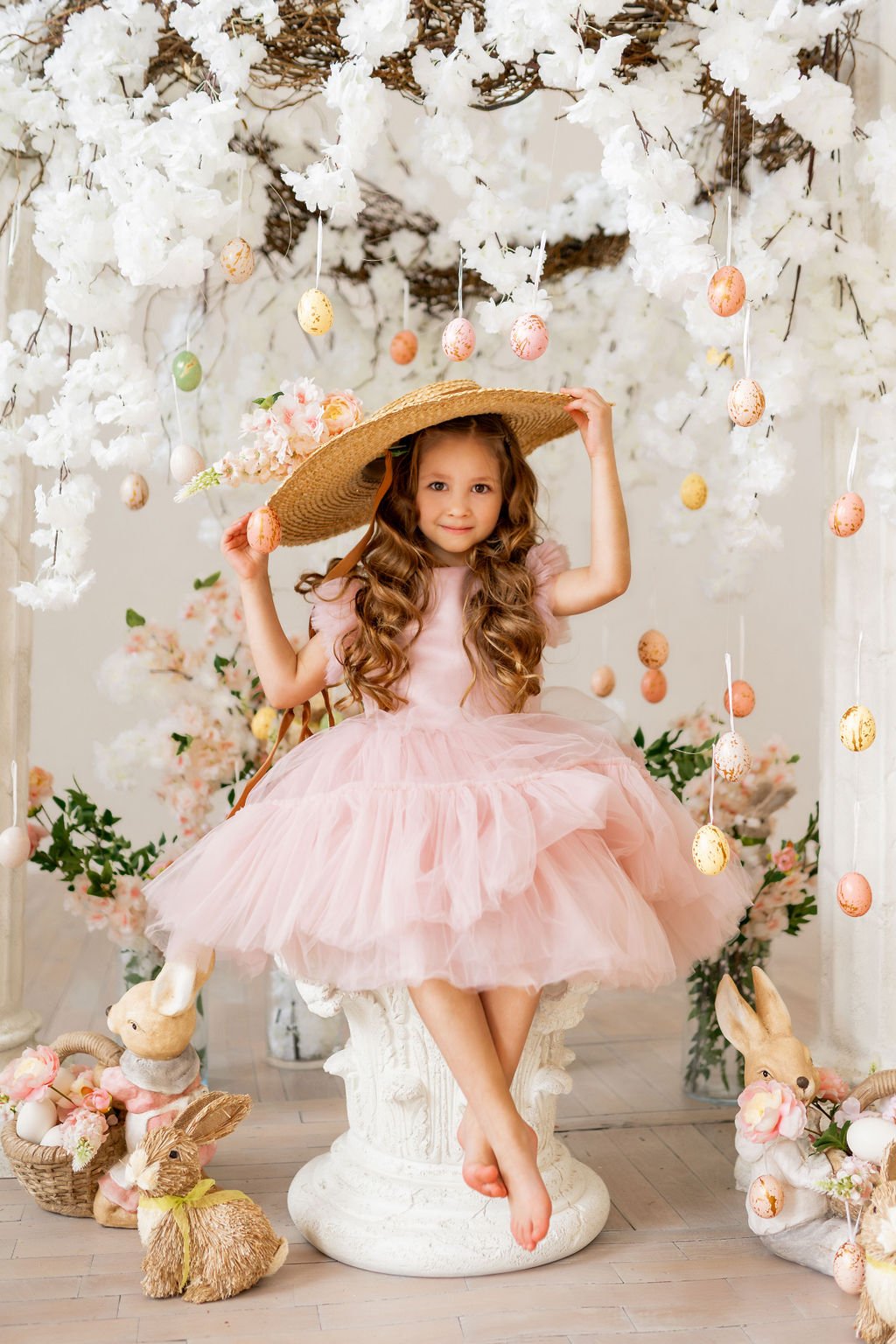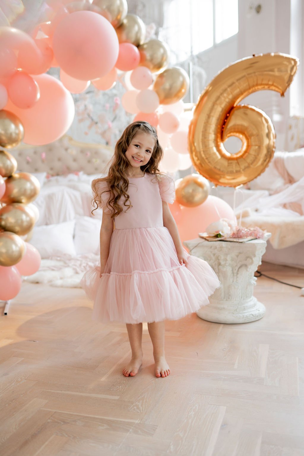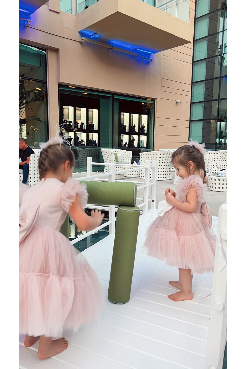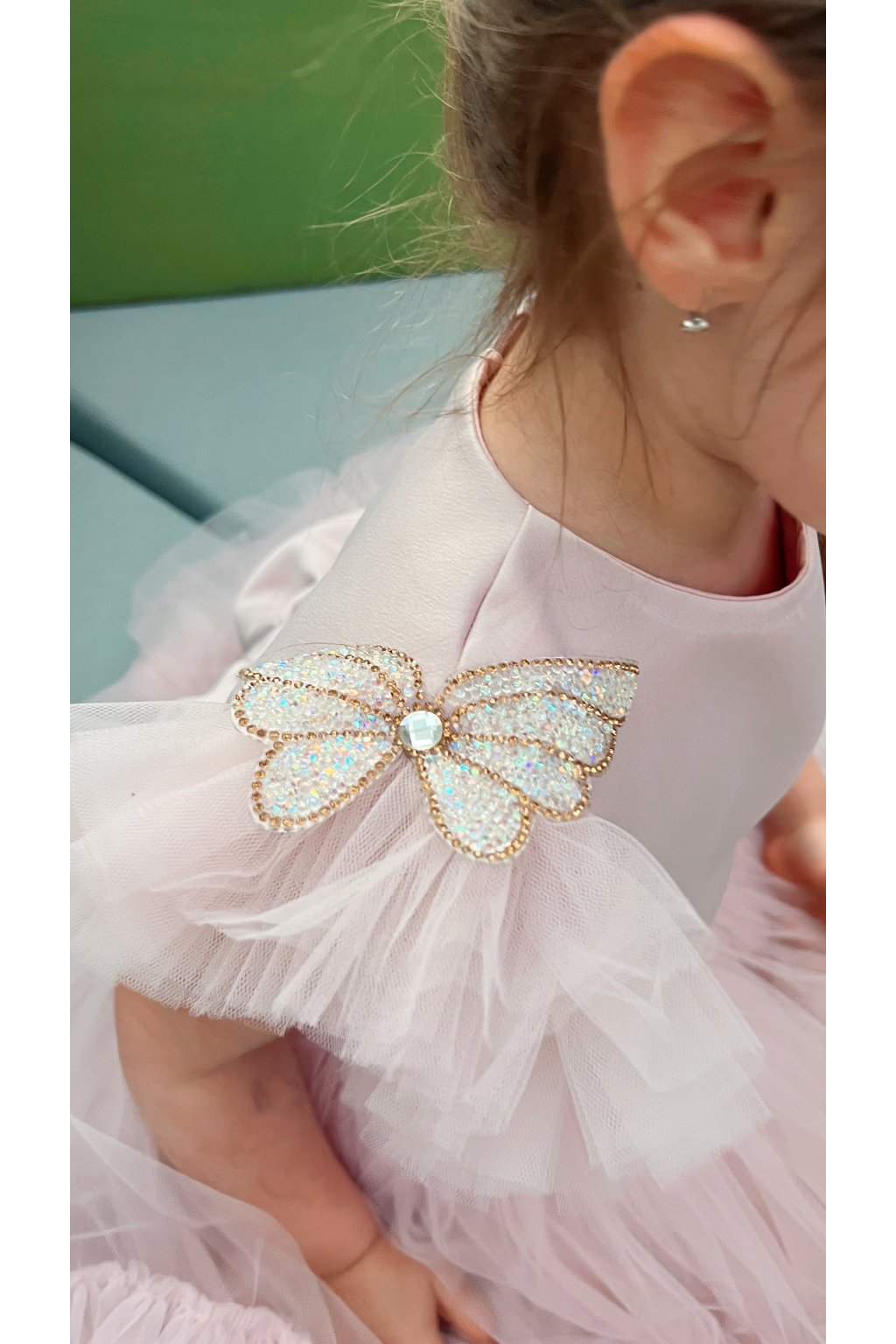 Jemně růžové šaty Klára s tylovou sukní a rukávky + aplikace motýla na rukávech + ozdoba o vlasů.