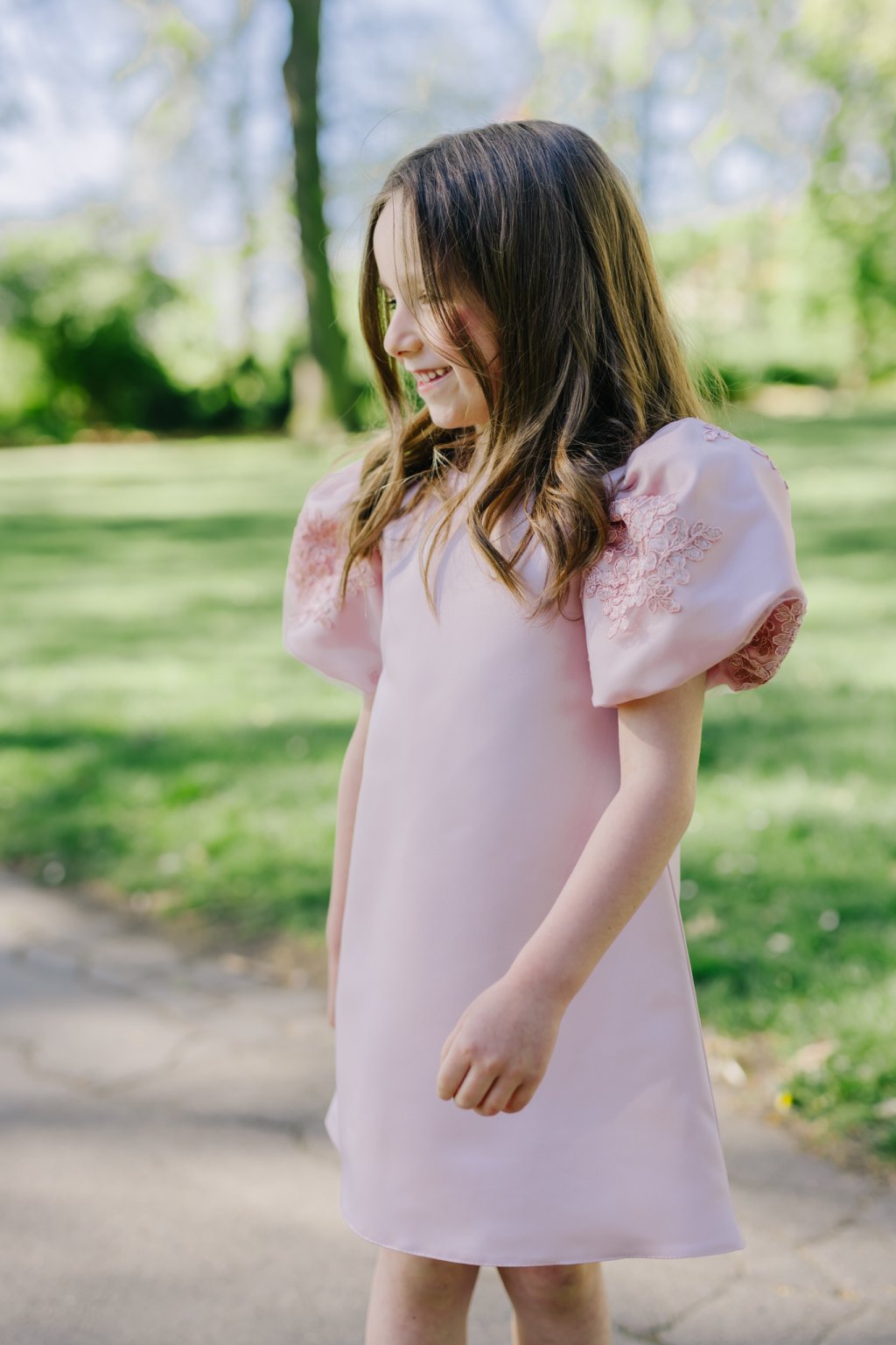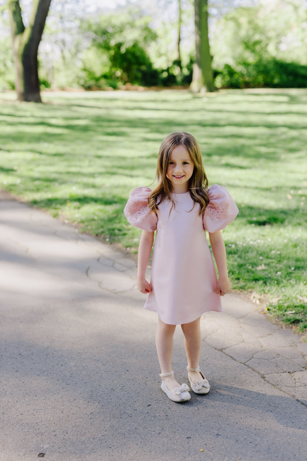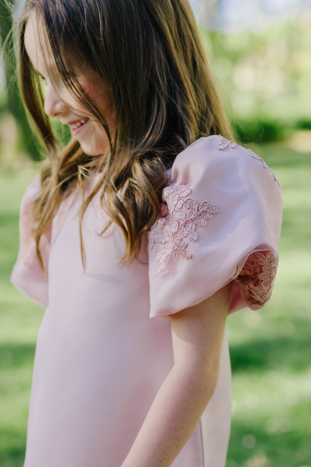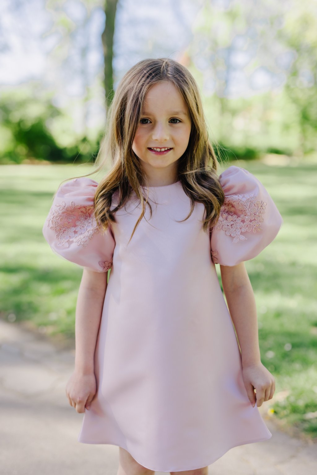 Dominantou šatů jsou výrazné balónové rukávy s krajkovou výšivkou, které dodávají celému modelu pohádkový šmrnc. Rovný střih zajišťuje volnost pohybu a maximální pohodlí pro každou malou slečnu.